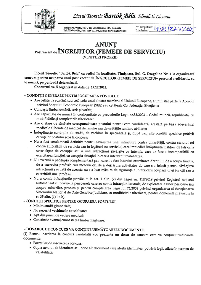 Liceul Teoretic „Bartók Béla” cu sediul în localitatea Timișoara, B-dul Gen. Ion Dragalina nr. 11A organizează concurs pentru ocuparea unui post vacant de ÎNGRIJITOR (FEMEIE DE SERVICIU) – personal nedidactic, cu jumătate de normă, pe perioadă determinată. Concursul va fi organizat în data de 17.12.2025. Vezi PDF:
