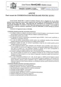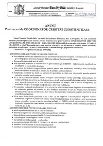 Liceul Teoretic „Bartók Béla” cu sediul în localitatea Timişoara, Bul. G. Dragalina Nr. 11A, în calitate partener proiect organizează concurs pentru ocuparea unui post vacant de COORDONATOR CREŞTERE CONŞTIENTIZARE (COD COR 242403 – ORGANIZATOR FORMARE) în proiectul transfrontalier INTERREG VI-A RO-HU cu titlul „Renewable energy and no-waste principle – for the benefits of different sectors: authorites, institutions, organizations”, proiect ID: ROHU00469, cu normă întreagă, pe perioadă determinată. Concursul va fi organizat în data de 09.04.2026. Vezi anunțul întreg în format PDF