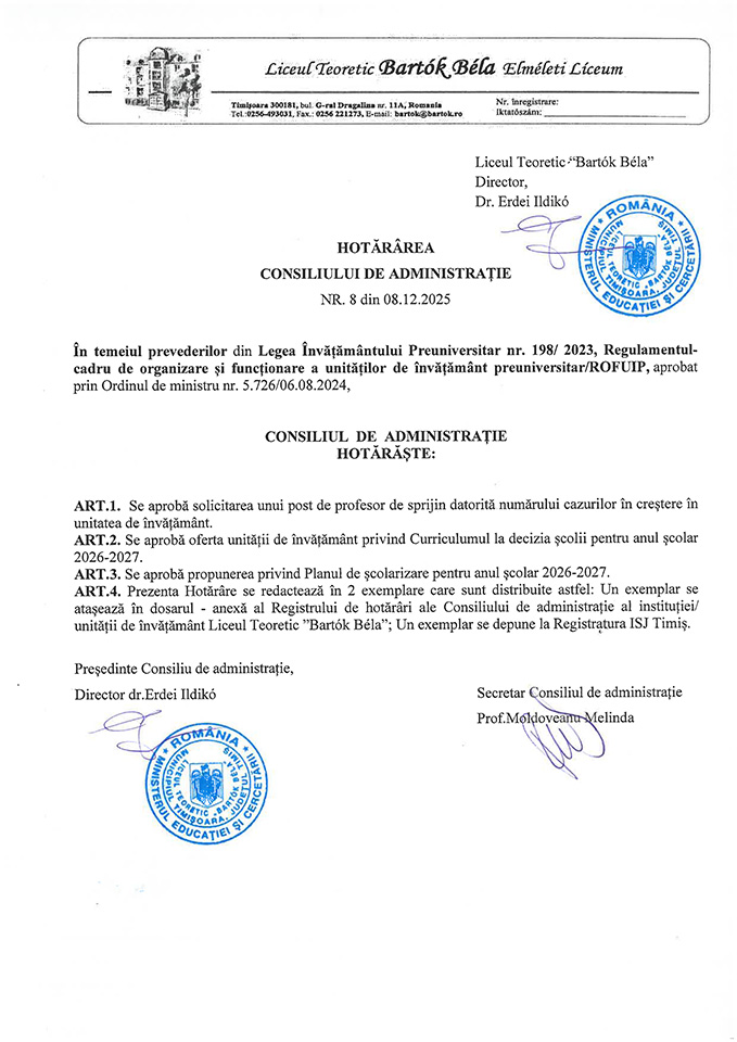 Hotărârea Consiliului de Administrație nr.8 din 08.12.2025