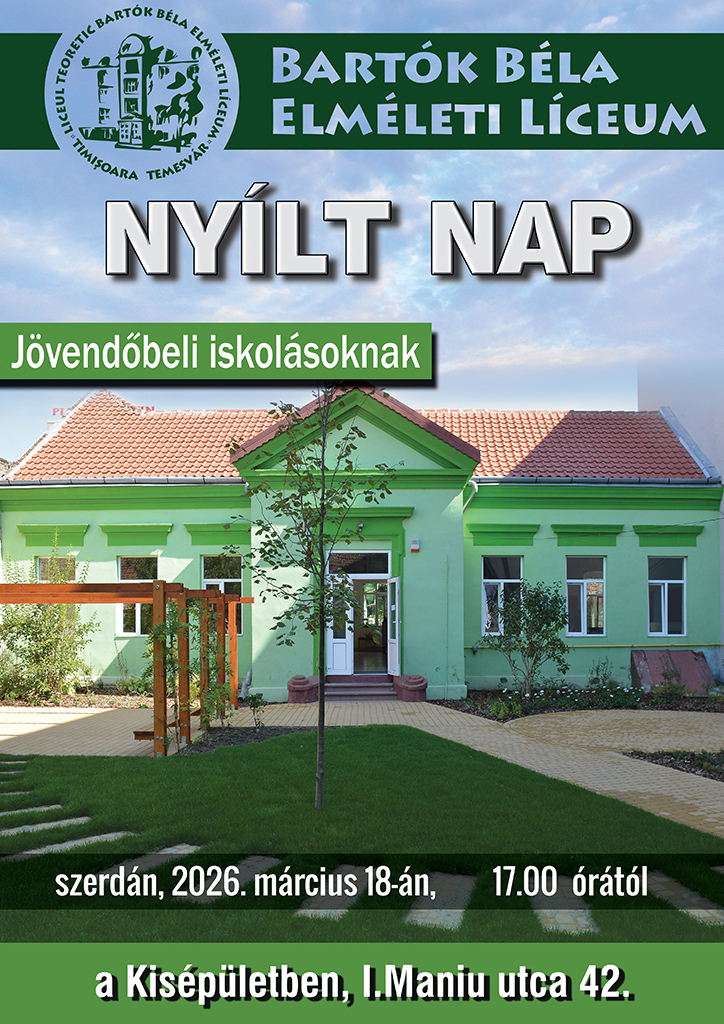 2026. március 18-án, szerdán, 17 órától Nyílt Napot szervezünk a Kisépületben (I.Maniu u. 42.). Ebből az alkalomból bemutatjuk az iskola ajánlatát és megtekinthetők az előkészítő osztályosok osztálytermei valamint az épület egyéb terei: mozgásterem, ebédlő, kalandpark.