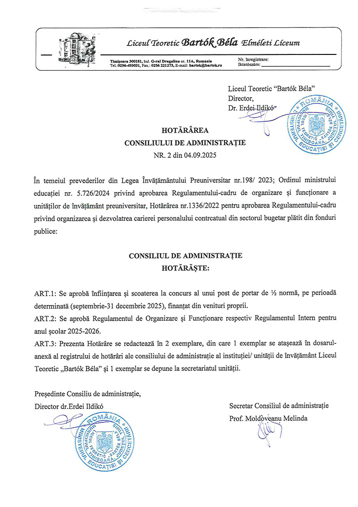 Hotărârea Consiliului de Administrație nr.2 din 04.09.2025